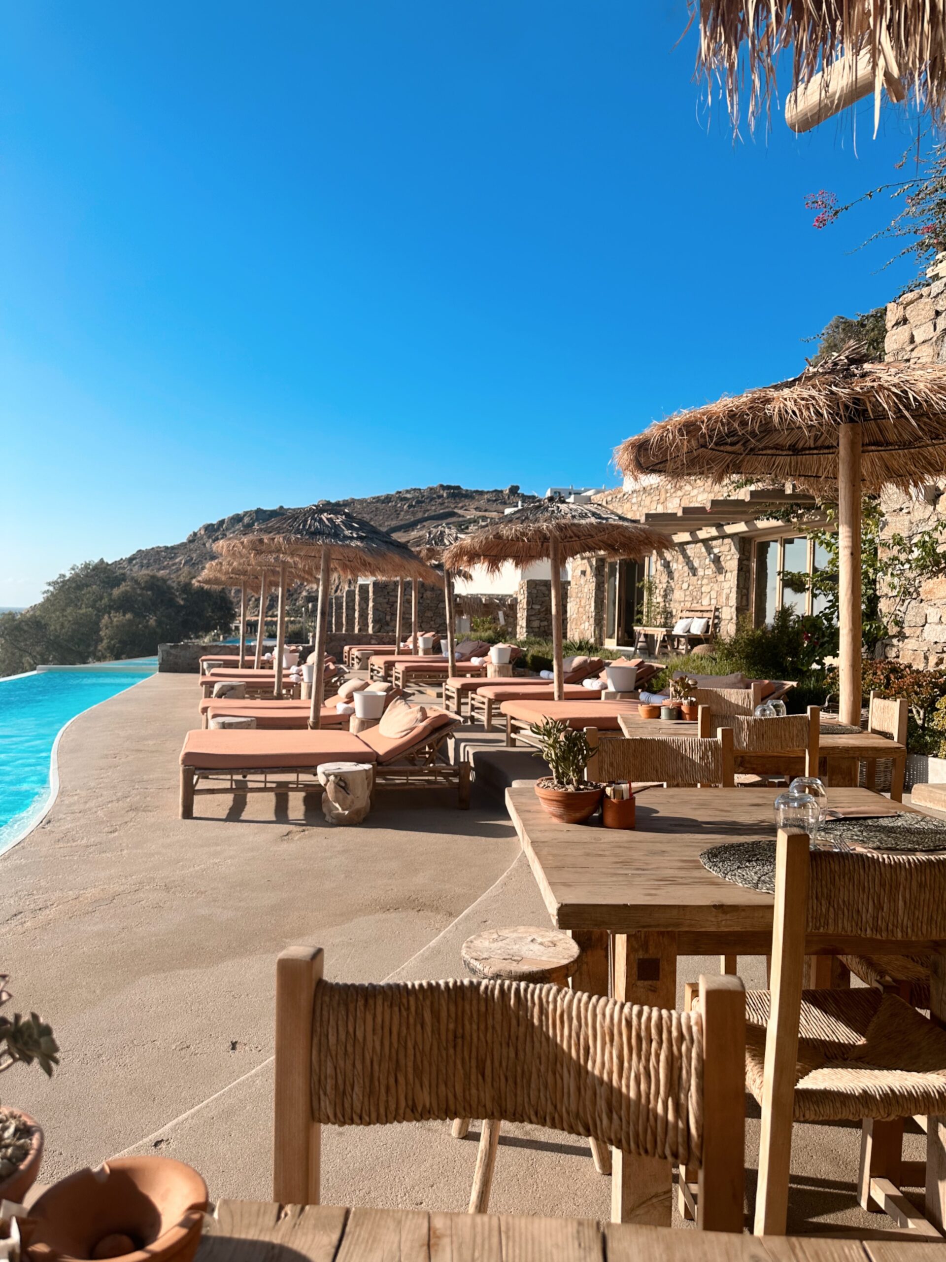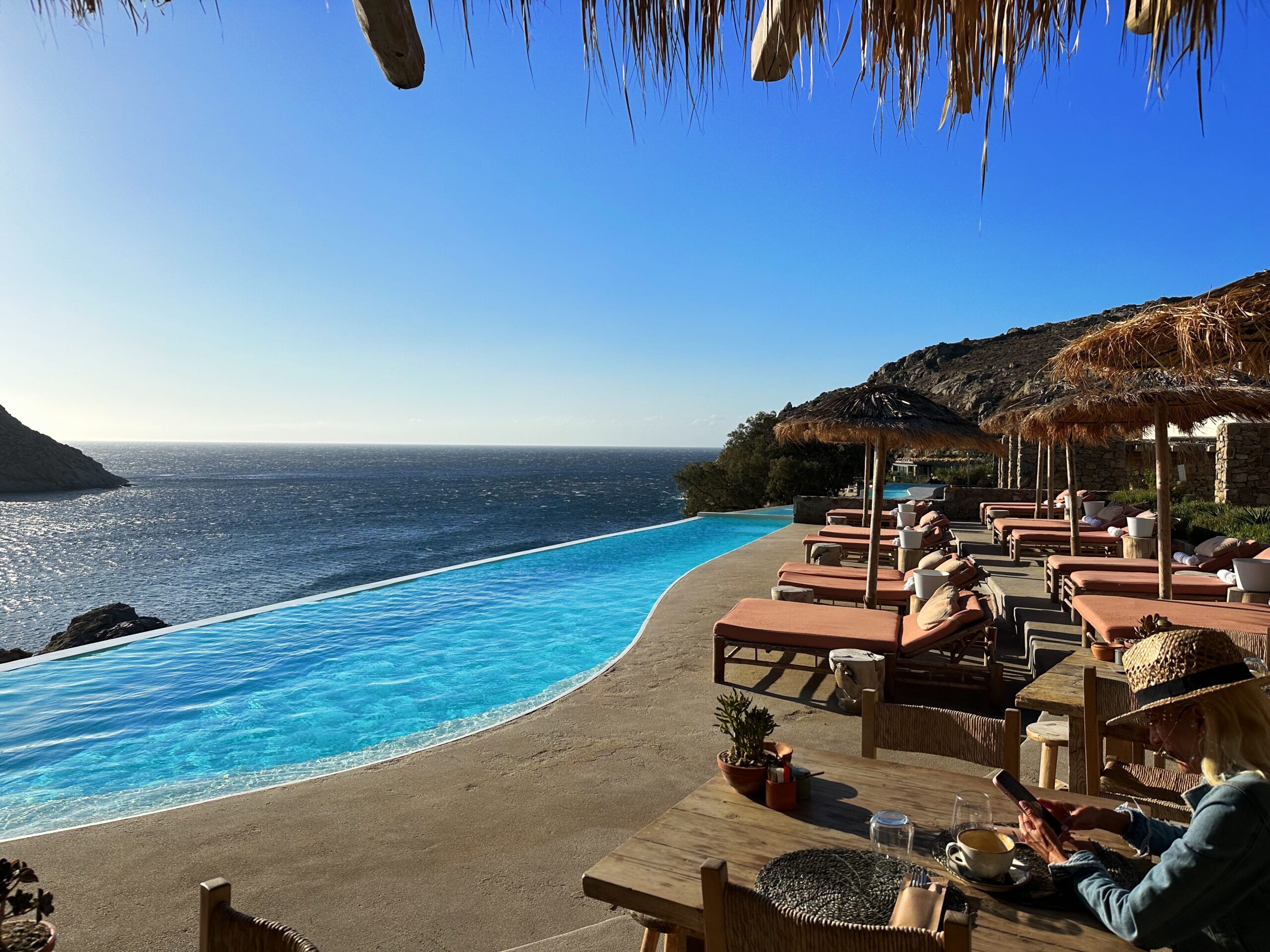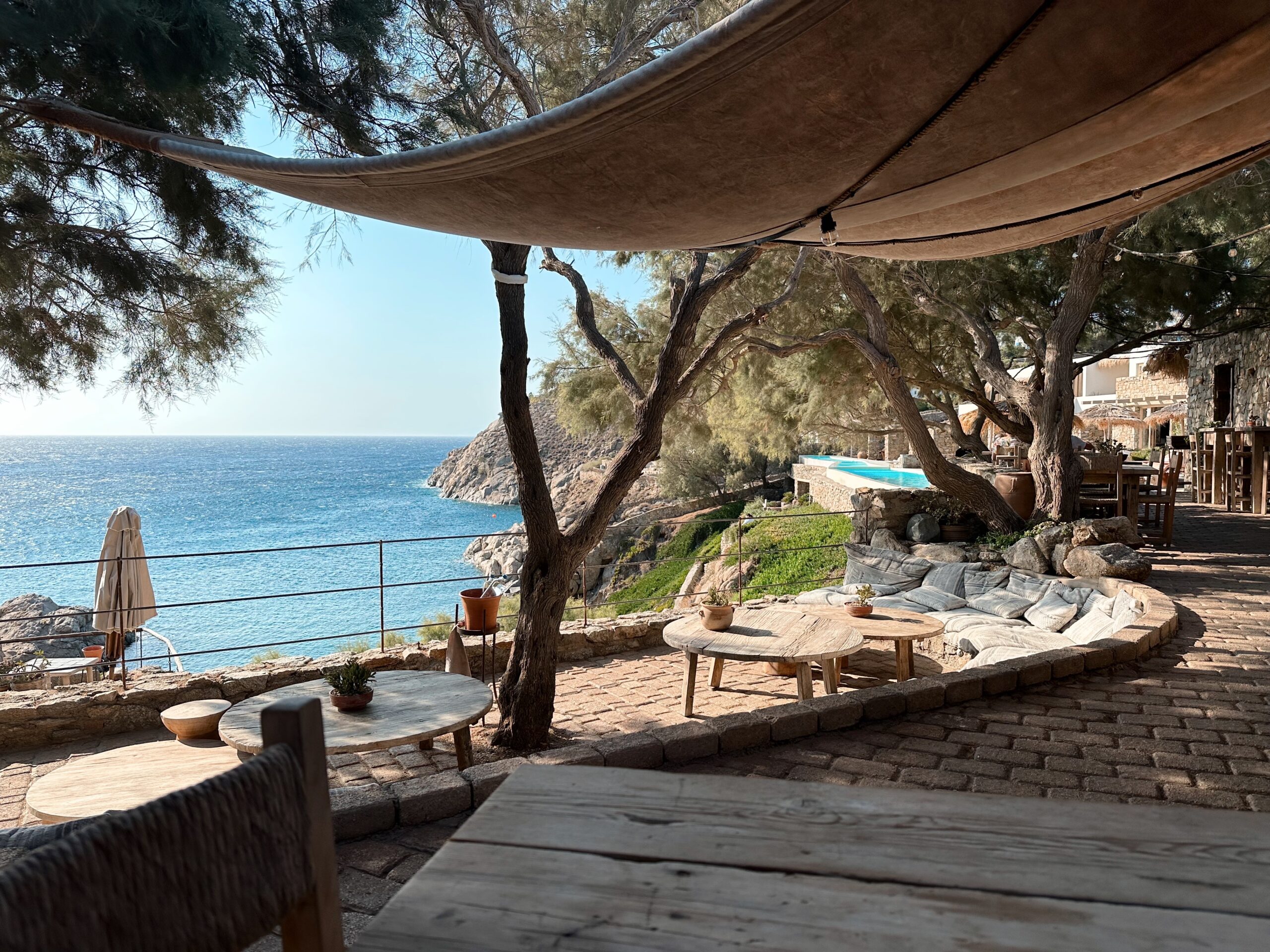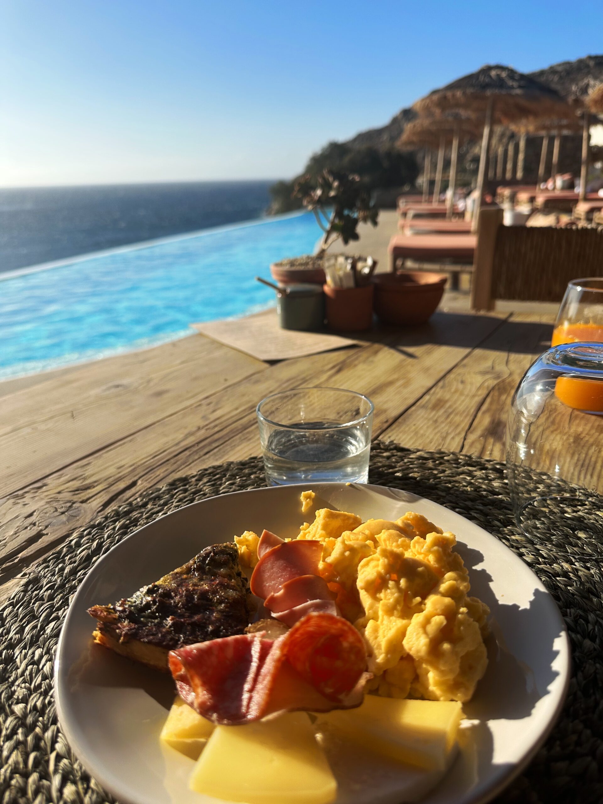 Since I didn’t want the party vibe of Mykonos at all, I chose to stay and eat the hotel every day and it did not disappoint. The dinner setting was like incredible since you literally ate in a cliff. You have the option eating the cliff side or by the pool where the breakfast is served. They also had two menus, either The Taverna menu or the Raw menu which was more sushi style. I opted for sushi one night of my 4 night stay there. The Taverna menu had traditional greek dishes and the orzo pasta with shrimp is a must try and for dessert you HAVE to get the phyllo pistachio!