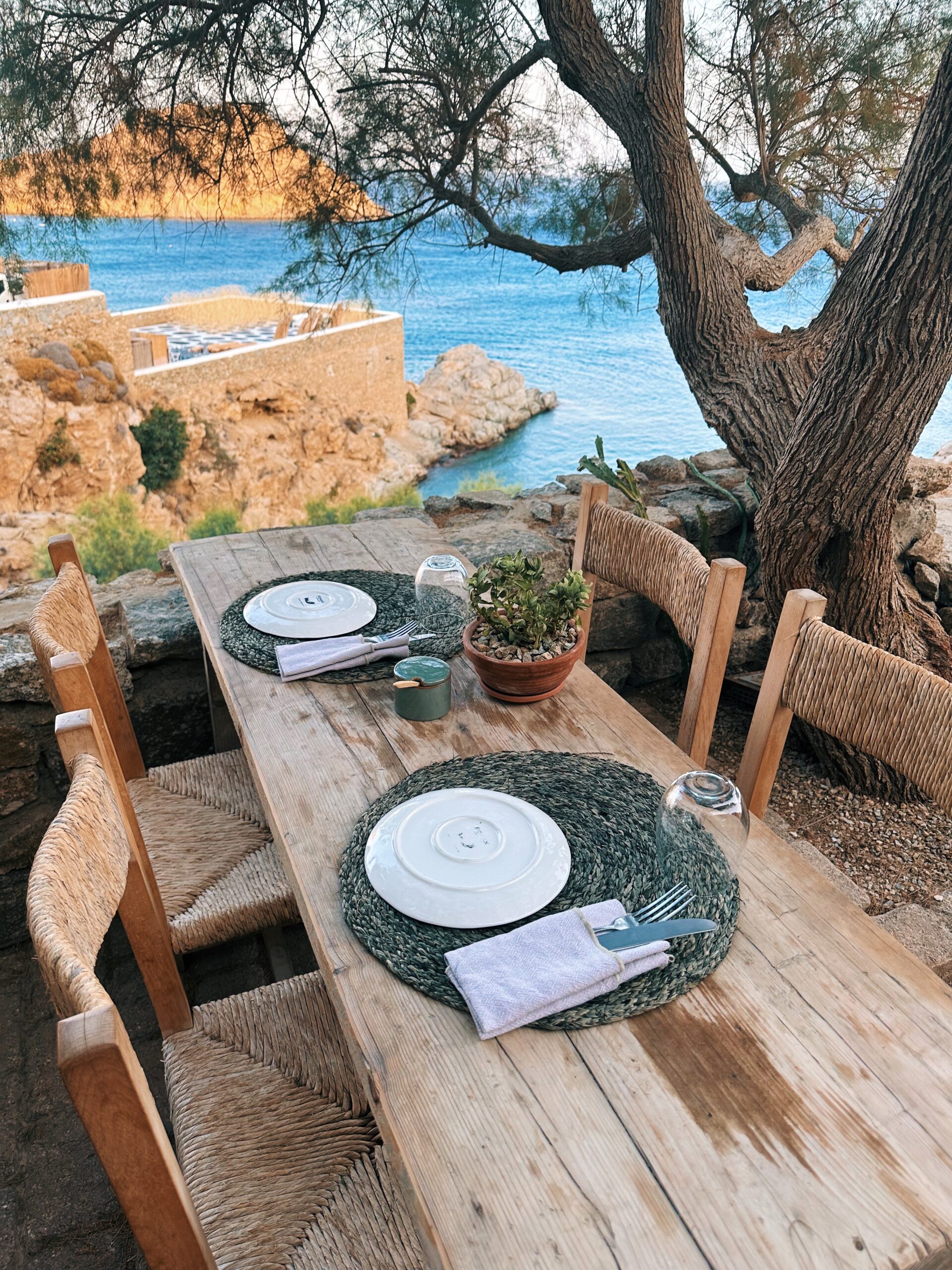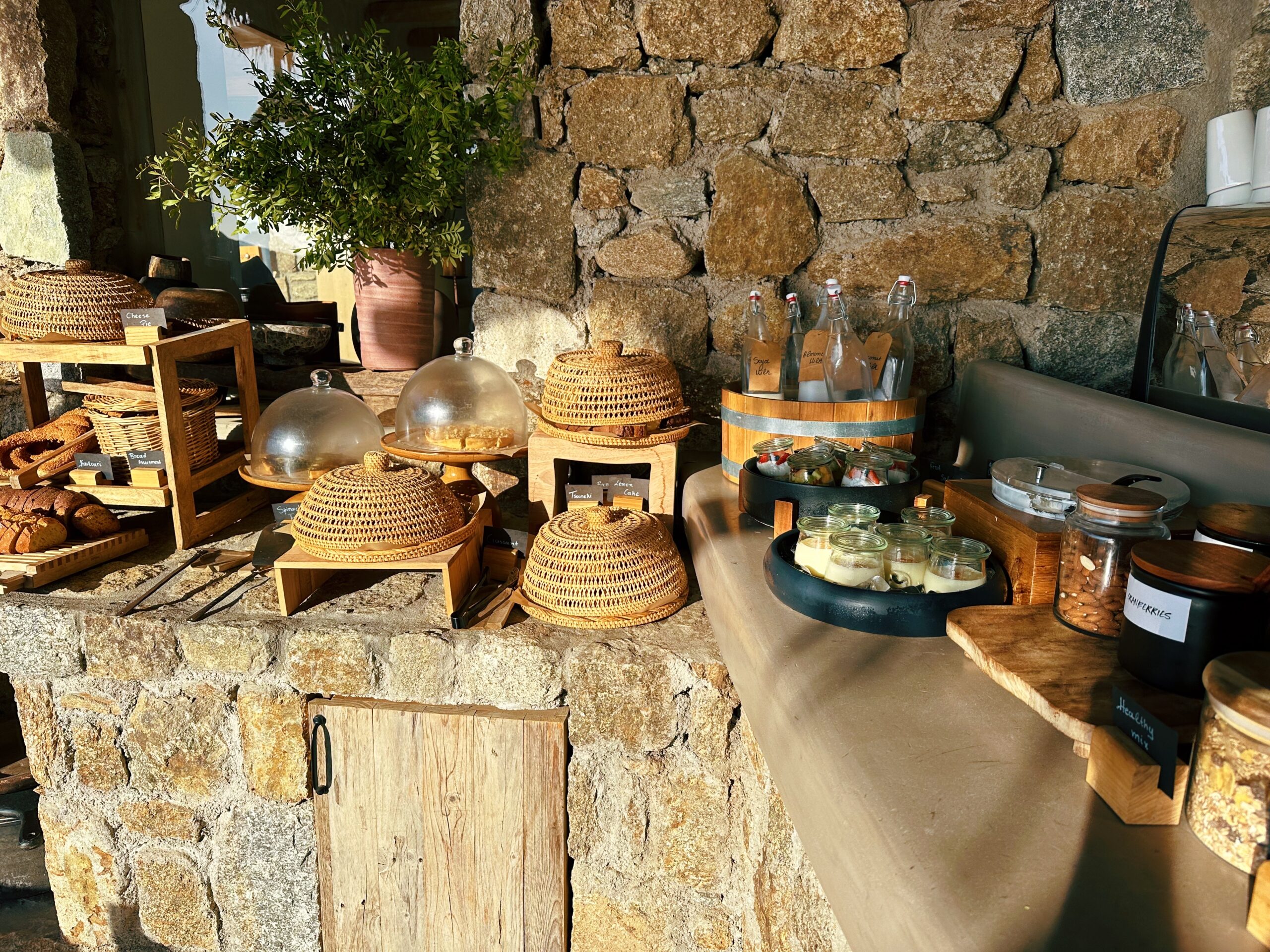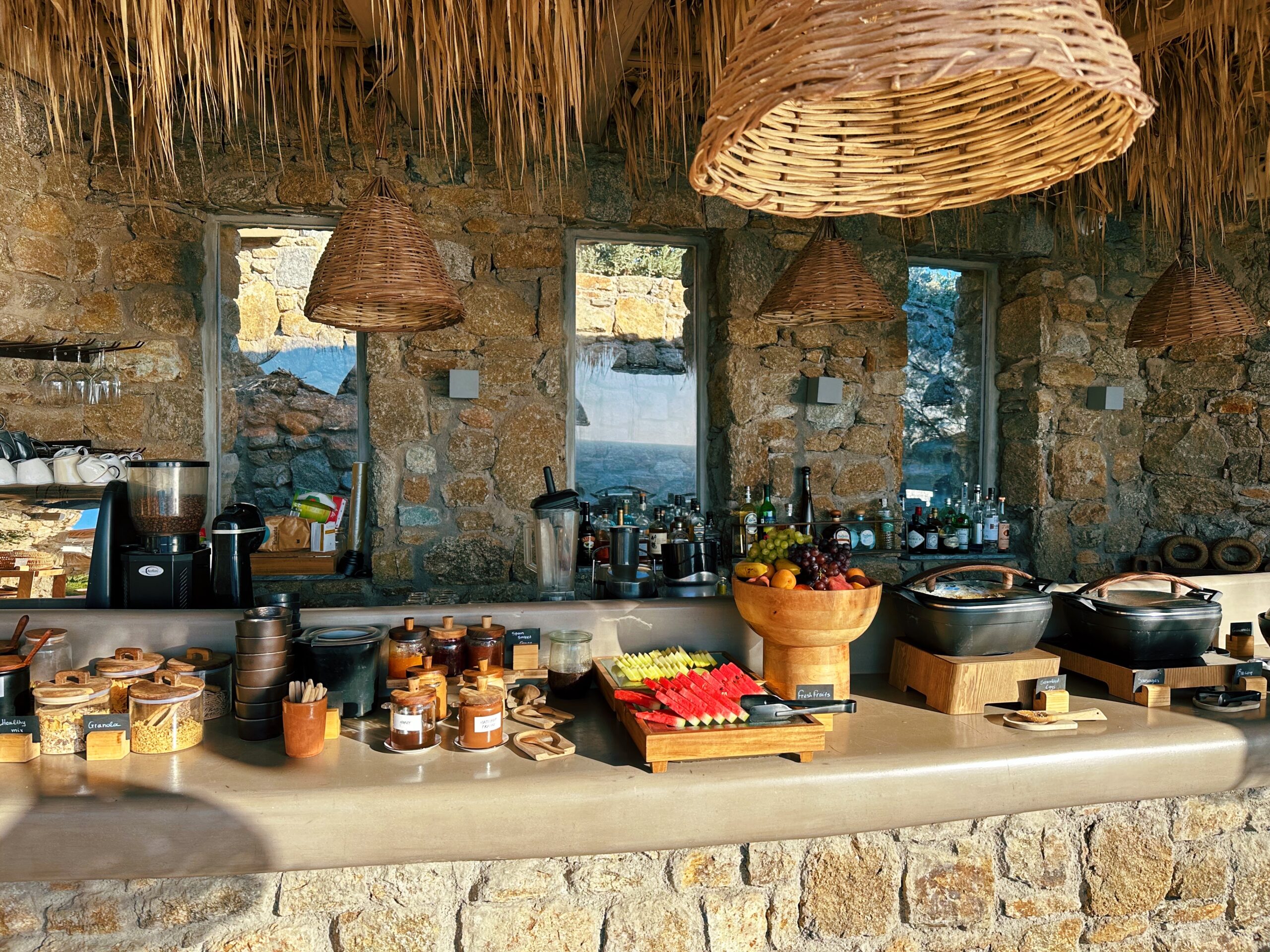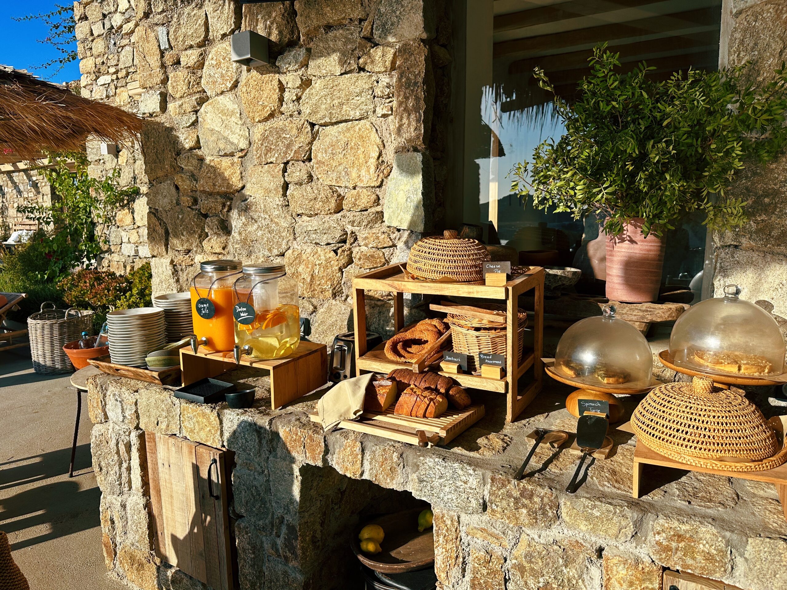Since I didn’t want the party vibe of Mykonos at all, I chose to stay and eat the hotel every day and it did not disappoint. The dinner setting was like incredible since you literally ate in a cliff. You have the option eating the cliff side or by the pool where the breakfast is served. They also had two menus, either The Taverna menu or the Raw menu which was more sushi style. I opted for sushi one night of my 4 night stay there. The Taverna menu had traditional greek dishes and the orzo pasta with shrimp is a must try and for dessert you HAVE to get the phyllo pistachio!